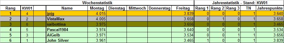 VistaMax Januar 9, 2010 Wettspiel: DAX intraday tippen Herzlich Willkommen zum DAX intraday tippen! +++ Jeder ist herzlich eingeladen +++ GEÄNDERTE Spielregeln!!!!!!!!!!!!!! Spieldauer: 1 Woche / tägliche Tippabgabe Wann wird getippt: tägliche Tippabgabe bis 02.00 Uhr möglich Ein Einstieg während der Tippwoche ist möglich! Was wird getippt: DAX a. DAX Schlussstand des folgenden Tages b. DAX Höchststand des folgenden Tages Punkteberechnung: Die Start-Punktezahl beträgt 5.000 Punkte Beispiel: a. Schlusstand: Tipp: 4.345 ------------ Istwert: 4.300 Differenz: 45 b. Höchststand: Tipp: 4.380 ----------------- Istwert: 4.400 Differenz: 20 45 + 20 = 65 Punkte Abzug Punktezahl nach dem ersten Tipptag: 5.000 Startpunkte - 65 = 4.935 Punkte Wer am Freitag die höchste Gesamtpunktzahl hat, ist der Sieger !!! Sollte jemand an bestimmten Tagen nicht tippen können, hat er die Möglichkeit seinen Tipp vorab abzugeben. Tage ohne Tippabgabe werden mit dem höchsten Tagespunktabzug + 1 bewertet. Sonderpunkte: Tippabgabe zwischen 24.00 Uhr - 02.00 Uhr = 25 Strafpunkt Tippabgabe vor 18.00 Uhr = 25 Gutschriftpunkte (außer Sonntag Abend) Genaue Punktzahl eines Tageswertes getippt = 50 Gutschriftpunkte Gewinn: Der Sieger der jeweiligen Woche erhält unter seinem Avatar den DAX-Intraday-Tippen-Wanderpokal Zusätzlich zum Wochen-Wanderpokal gibt es aufgrund der Jahrestabelle, die auf Basis der Anzahl erster, zweiter, dritter Plätze auch noch einen Jahres-Wanderpokal. Gruss VistaMax Diesen Beitrag teilen Link zum Beitrag