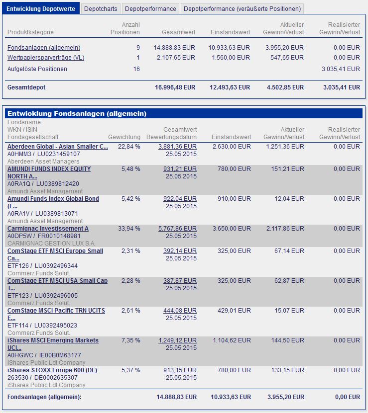 Der Investissement sieht 2015 bisher ganz gut aus, 17,39 % Performance. Wenn ich jetzt den Mittelwert der Performance vom MSCI North America, STOXX Europe 600, Small Cap USA und Small Cap Europa für dieses Jahr zusammen Rechne, komme ich auf 17,38%. Nur hat der Investissement noch Asien, Lateinamerika und den Nahen Osten im Bauch. Das ist mir aufgefallen.