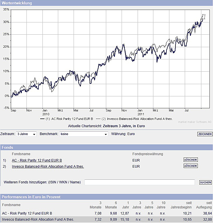 Man könnte natürlich auch einen Tausch zwischen den AC - Risk Parity 12 und den Invesco Balanced Risk Allocation Fund in Erwägung ziehen, da sie doch änlich sind nur der eine noch günstiger.