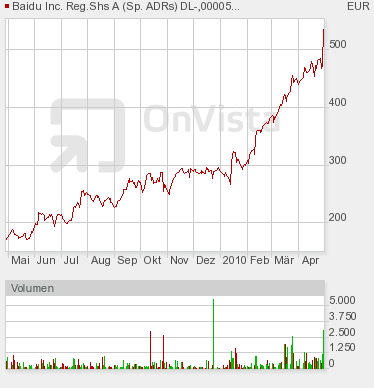 Fondshai Januar 15, 2010 WKN: A0F5DE, ISIN: -- Unternehmensinformation: Baidu (chin. 百度, bǎidù) ist eine chinesische Suchmaschine. Eine Besonderheit ist die Möglichkeit zur Suche nach MP3-Dateien. Laut der Statistik von Alexa Internet gehört Baidu mittlerweile zu den zehn weltweit am häufigsten aufgerufenen Webseiten.[2] Zur Zeit hat Baidu in China einen Marktanteil von 77 Prozent im Bereich Suchmaschinen.[3] Seit dem 5. August 2005 ist Baidu an der Börse notiert. (Wikipedia) http://www.boerse-go...-China-Konflikt,a2053973,b227.html Sieht nicht schlecht aus! Was sagt ihr? Diesen Beitrag teilen Link zum Beitrag
