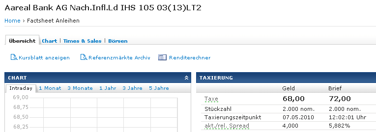 1erhart Juni 22, 2010 Finde die als allererstes gepostete AAREAL Anleihe ISIN: DE0001615557 sehr interessant. Die Börse Stuttgart nennt auch als kleinste handelbare Einheit 2500 und als Emissionsvolumen 3,00 Mio. Das ist schon sehr ungewöhnlich. Das einzige Rating, dass ich gefunden habe, ist von FITCH beim Bondboard und zwar BBB+ So viel ich gesehen habe nur Handel in Frankfurt. Allerdings keine Umsätze in den letzten Monaten. Bei einem aktuellen Kurs von 42,05 (keine Umsätze) wäre das eine absolute Traumrendite bei einem Zinssatz von 7,75% (laut Börse Stuttgart). Prospekt habe ich allerdings nicht gefunden. Da war nur in der letzten Zeit kein Umsatz sondern die ganzen Jahre nicht. Habe mal nachgesucht da wurde nicht einmal gehandelt als es 2008/2009 bis unter 20 im Kurs nach unten ging. Was will ich mit einer Traumrendite wenn ich sie nicht kaufen kann. Entweder geht hier nur ausserbörslich was oder gar nicht. Diesen Beitrag teilen Link zum Beitrag