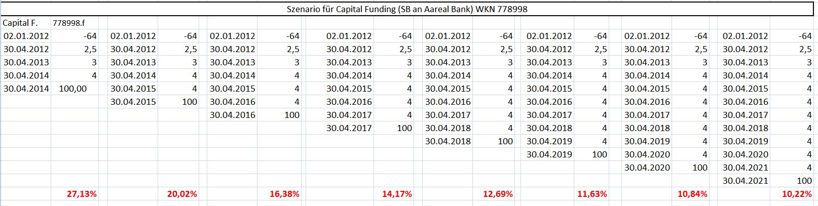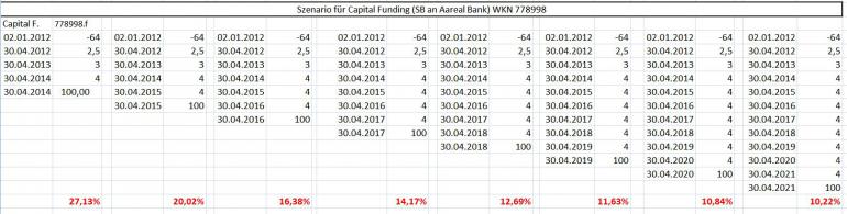 Fleisch Januar 2, 2012 sei nicht zu streng mit ihm, in meinem Musterdepot finden sich auch diese Art von Fragen Aber mal wieder was zum Thema. Modell 707008 778998 steht derzeit bei rund 39 64, die Umlaufrendite liegt bei knapp 1,5 % und der Aufschlag rettet auch nicht mehr wirklich was. So lange sie aber die Kupons bedienen ergibt sich beim aktuellen Kurs eine Rendite im zweistelligen Bereich. Selbst bei 2-3 Kuponausfällen aber Rückzahlung zu 100 % (=25/Stück) ist das hochattraktiv. Gleiches gilt für den GS 804118 , der durch sein dürfte. Hier daher nochmal das Szenario mit angepassten Kupons EDIT: neue Kalkulation hochgeladen, WKN und Kurs korrigiert Diesen Beitrag teilen Link zum Beitrag