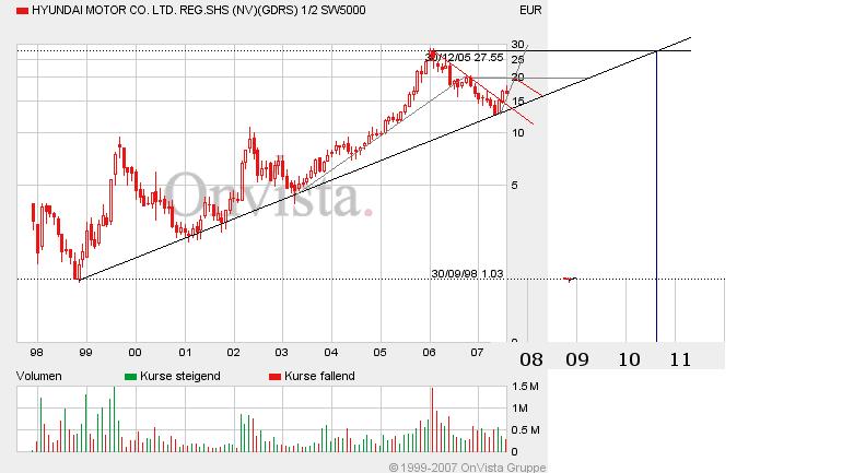 Ich habe mal ein charttechnisches Bild angehängt, das den derzeitigen Verlauf etwas erklärt. Danach hat Hyundai lediglich den langfristigen primären Aufwärtstrend erreicht, der eine jährliche Rendite von BIS ZU 28% verspricht, wenn man am Tiefpunkt eingestiegen wäre ;)