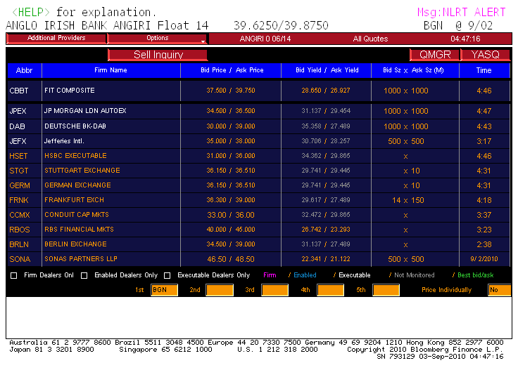 Polikarpov September 3, 2010 Momentane Situation sieht so aus. Ansonsten nur eine neue Schlagzeile: By Esteban Duarte Sept. 3 (Bloomberg) -- Anglo Irish Bank Corp. Ltd. wont make an optional interest payment due on Oct. 5 on its 300 million pounds of callable fixed- to floating-rate undated subordinated notes, it said in a statement. Gruesse, P. Diesen Beitrag teilen Link zum Beitrag