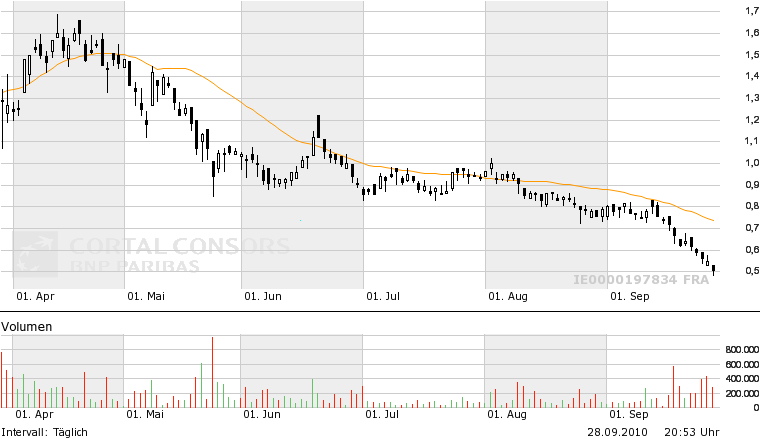 täubchen September 28, 2010 AIB- und BoI-Aktienkurse fallen wie Steine. Müssen Staaten eigentlich auch Abschreibungen auf Investitionen vornehmen? Die Investition ist ja jetzt definitiv weniger wert. Kannst Du das irgendwie konkretisieren? Ich sehe da kaum gesunkene Kurse und erst recht keine Umsätze zu gesunkenen Kursen. Bitte. Deutlich sinkende Kurse bei steigendem Volumen. Die Kurse laufen ziemlich parallel. Momentan zeigt ja alles was mit Irland zu tun hat nach unten (außer den Risikoaufschlägen für Staatsanleihen ). Diesen Beitrag teilen Link zum Beitrag