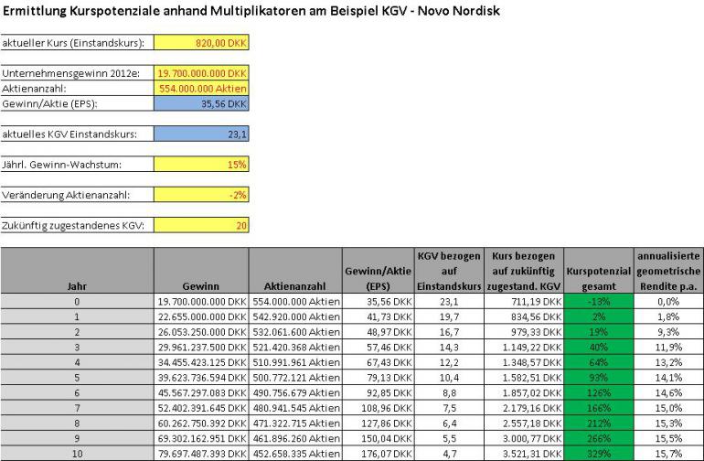 juro Juni 24, 2012 · bearbeitet Juni 24, 2012 von juro Auf die Schnelle. Um das ganze mit Multiples bezogen auf KGV zu verdeutlichen ein kleines Beispiel - selbstverständlich mussten Annahmen getroffen werden bzw. Prognosen. Ausgehend von den geschätzten Zahlen 2012 ergibt sich bei Novo Nordisk ein KGV von 23,1. Es wird unterstellt, dass das Unternehmen den Gewinn zukünftig 15% p.a. steigern kann (die letzten 5 Jahre waren es über 20%, die letzten 10 Jahre 16% p.a.). Wenn ich dem Unternehmen wie im unteren Beispiel ein faires KGV von 19 zugestehe (also deutlich niedriger als derzeit) ergäben sich folgende Kurspotenziale in den nächsten 10 Jahren: Nach 5 Jahren ergäbe sich unter obigen Annahmen ein Kurspotenzial von 66% (10,6% p.a.), nach 10 Jahren 233% (12,8% p.a.). Wenn man dem Unternehmen sogar ein höheres KGV als 19 zugestehen würde, würden die Kurspotenziale entsprechend höher ausfallen. Oder umgekehrt wie oben auch ersichtlich wird: wenn sich der Kurs nicht bewegen würde ergäbe sich nach 5 Jahren ein KGV von 11,5 bzw. nach 10 Jahren ein KGV von 5,7. Was als faires KGV bezogen auf die Qualität extremst zu wenig wäre, sodass Kurssteigerungen die Folge wären. Dies nur als Beispiel zur Verdeutlichung, dass ein statisches KGV auf Basis vom Vorjahr bei profitablen Wachstumsunternehmen isoliert betrachtet nichts aussagt bzw. höhere KGV's absolut gerechtfertigt sein können u. bezogen auf die Zukunft günstig sein können. Und welchen Einfluss profitables Wachstum auf die Kursentwicklung haben kann langfristig. Selbstverständlich sind die Annahmen angreifbar. Jeder sollte sich selbst ein Bild machen u. dementsprechend handeln. Diesen Beitrag teilen Link zum Beitrag