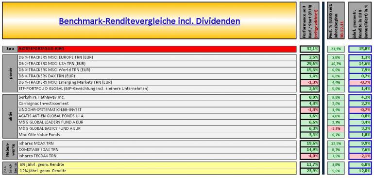 juro Juni 29, 2012 · bearbeitet Juni 29, 2012 von juro Sieht alles vernünftig aus derzeit. Das Aktien Portfolio hat sich relativ unabhängig den makroökonomischen Turbulenzen die letzten Monate performancemässig robust verhalten. Und notiert Stand heute abend 2,3% (entspricht 3,0%-Punkte) unter All-Time-High seit Beginn Performancemessung vor 2 Jahren. Diverse Indizes bzw. aktive Fonds hatten die letzten Monate deutlich Performance eingebüsst. Ob DAX, MSCI Emerging Markets, MSCI Europe, ein BIP-gewichtetes Aktien-Portfolio oder ein aktiver Value-Fonds wie der Lingohr etc. - wie in unterem Beispiel dargestellt. Lediglich der MSCI USA konnte sich ebenfalls stabil halten - gemessen in EUR - nachdem der USD gegenüber dem EUR in den letzten Monaten über 8% zugelegt hat u. somit die Performance des MSCI USA gemessen in EUR über 8% besser ist als in USD. Das Aktien-Portfolio hier basiert auf Stock-Picking. Makroökonomie spielt keine bzw. kaum eine Rolle mehr. Ebenso ist das Portfolio langfristig ausgerichtet. Die Robustheit liegt wahrscheinlich auch daran, dass zu einem ordentlichen Teil Unternehmen im Portfolio sind, die immer Konjunktur haben mit starker Qualität. Fokus liegt ebenfalls auf langfristig profitablem Wachstum der Unternehmen. Kurzfristige makroökonomische Einschätzungen / Entwicklungen oder auch Emotionen stören da nur u. sind schädlich. Einfach unkalkulierbar kurzfristige Performances - zumindest für mich. Und das ist auch gut so. Stockpicking bzw. Kauf auf Basis langfristiger Einschätzung der Unternehmen - mit regelmässigen Überprüfungen in monatlichen Intervallen der einzelnen Unternehmen. Zuviele Unternehmen im Portfolio schaden da nur bzw. erhöhen unnötigerweise die Komplexität bezogen auf meine Strategie. Auch wenn im Laufe der Zeit mit frischem Geld weitere Unternehmen dazukommen werden. Mehr wie 15 Werte werden es auch in ferner Zukunft nicht werden aus Komplexitätsgründen. Mehr Werte bringen für mich keinen Mehrwert sondern mehr Komplexität. Bzw. Annäherungen an den Markt. Stand heute sieht es beim Aktien-Portfolio wie folgt aus: Ein schönes Wochenende u. Beste Grüsse Diesen Beitrag teilen Link zum Beitrag