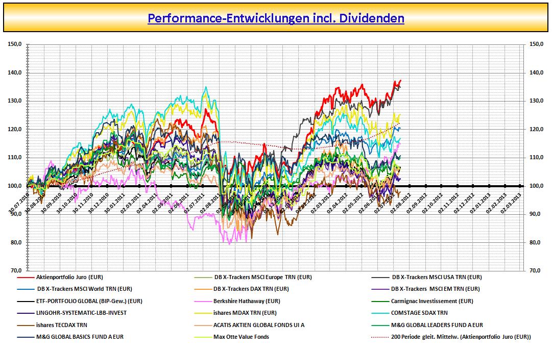 juro Juli 3, 2012 · bearbeitet Juli 3, 2012 von juro Stand heute notiert das Aktien-Portfolio auf Höhe des All-Time-High mit +35,8% seit Start Performancessung vor knapp 2 Jahren u. mit einer bisherigen Jahresrendite in 2012 von +24,8% derzeit. Miteingeblendet sind die passiven Benchmarks. Auch der MSCI USA TRN hat - gemessen in EUR! - seit Performancemessung ein neues ATH erzielt. Auch der MSCI World TRN liegt kurz vor ATH. MSCI Europe TRN, MSCI Emering Markets u. insbesondere auch der DAX liegen sehr deutlich unter ATH. Verabschiede mich in den Urlaub u. melde mich zu gegebener Zeit wieder. Beste Grüsse Diesen Beitrag teilen Link zum Beitrag