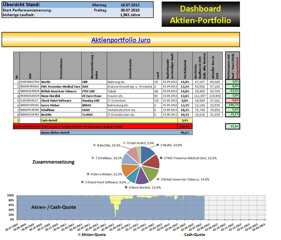 juro Juli 16, 2012 · bearbeitet Juli 16, 2012 von juro Am 10.07.2012 wurde bei meiner Depotbank die Dividende von Tesco eingebucht, die ich zwar nicht mehr im Portfolio habe aber am Ex-Tag 25.04.2012 drin war (Zahltag 06.07.2012). Schöne Dividendenrendite von ca. 4% zum damaligen Kurs, die in den Cash-Bestand des Aktien-Portfolios eingebucht wurde. Stand heute abend sieht es wie folgt aus: Heute konnte das Aktien-Portfolio ein neues All-Time-High erzielen mit +37,4% seit Performancemessung vor knapp 2 Jahren (incl. Dividenden). Beste Grüsse Diesen Beitrag teilen Link zum Beitrag