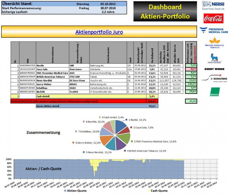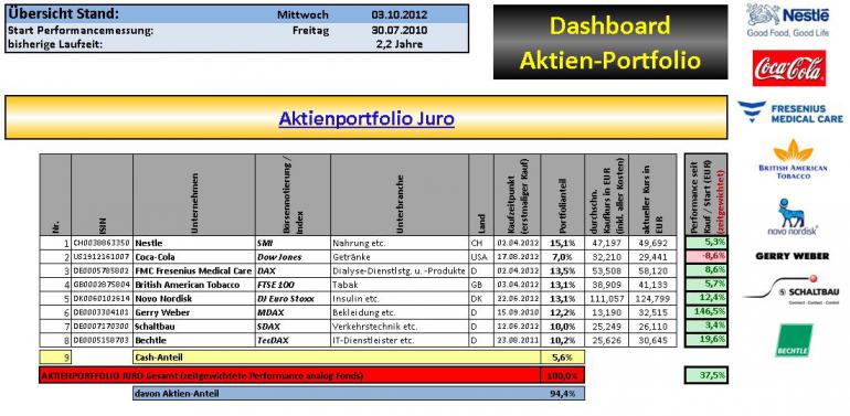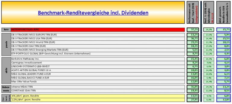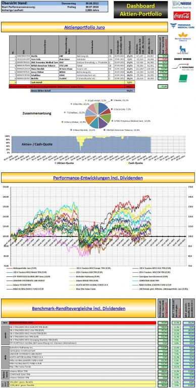 juro Oktober 2, 2012 · bearbeitet Oktober 2, 2012 von juro Stelle nochmals eine aktuelle Übersicht rein, auch wenn ich ursprünglich auf Jahresende verweisen wollte. Aufgrund der Langfristigkeit macht ein Update in kurzen Intervallen wie bisher keinen Sinn. Das wird sich ändern. Den TECDAX als Benchmark im Nebenwerte-Bereich hab ich rausgeschmissen, da m.E. als Benchmark untauglich u. teilweise sehr spekulativ (branchenbedingt, Turn-Around-Kandidaten, Zykliker, etc.). Ausnahmen bestätigen die Regel, es gibt teilweise wunderbare Unternehmen im Index, die solide u. stark sind u. sich als Langfristinvest eignen können. Insgesamt haben Unternehmensentwicklungen nur bedingt mit Entwicklungen der Volkswirtschaften zu tun - erst recht langfristig. Selbst wenn die Welt unterzugehen drohen sollte, gute Unternehmen werden sich langfristig durchsetzen u. die Gewinne u. die Free-Cash-Flows steigern können. Bei qualitativ guten Unternehmen wird sich Geduld auszahlen. Kurzfristig ist das Zockerei u. ggf. mit Kursrücksetzern verbunden. Kerngesunde Unternehmen zahlen weiterhin kontinuierlich solide Dividenden aus dem Cash-Flow u. nicht aus der Substanz. Und sorgen für Erträge ohne dass die Kurse steigen müssen. Derzeit eine komfortable Situation. Wer in den letzten Jahren im Aktienmarkt investiert war seit der Finanzkrise hat ordentlich Geld mit Aktien verdient. Langfristig erst Recht. Langfristig gibt es zu Aktien / Qualitätsaktien m.E. kaum Alternativen. Inflation frisst Kaufkraft auf. Gegen Jahresende werde ich noch ein Update einstellen, das wars dann für dieses Jahr. Änderungen werde ich ggf. posten. Beste Grüsse Diesen Beitrag teilen Link zum Beitrag