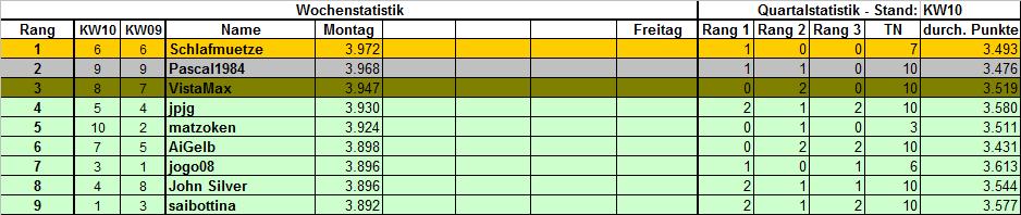 Zusätzlich zum Wochen-Wanderpokal kann aufgrund der Quartalstabelle ein Quartal-Wanderpokal gewonnen werden, der den Sieger ein Quartal lang