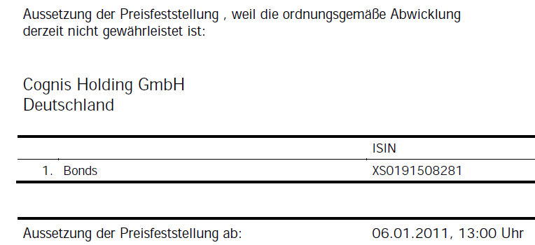 vanity Januar 7, 2011 heute 05.01.2011 auf auf der Börseplatz Frankfurt Zeit: 09:03:52 Kurs: 103,40 Volumen: 65000 Die Anleihe wurde mit Ablauf des 04.01.2011 nicht eingestellt. Oder sehe ich das falsch? In Stuttgart schon. Seit gestern ist auch der Handel in Frankfurt und auf XETRA eingestellt Es ist aber reichlich Ersatz vorhanden: Diesen Beitrag teilen Link zum Beitrag