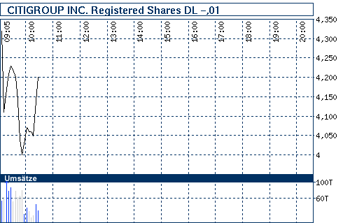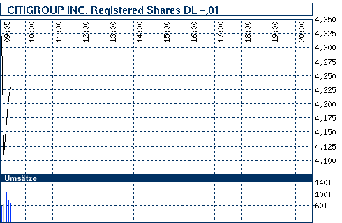 Risiko November 24, 2008 CITIGROUP in Frankfurt 24.11. 10:23 4,20 1.24 +41.89% Die USA haben der im Zuge der Finanzkrise ins Schlingern geratenen Citigroup Corp erneut milliardenschwere staatliche Hilfen gewährt. Am späten Sonntagabend einigten sich die US-Regierung und das New Yorker Finanzhaus auf eine finanzielle Unterstützung. Diesen Beitrag teilen Link zum Beitrag