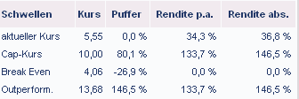jwulf November 25, 2008 Ich denke die Investoren haben das Vertrauen zurück gewonnen bei der Citigroup. NYSE 24.11. 22:01 5,95$ 2.18 +57.82% Ich glaube, daß man nicht von Vertrauen zurückgewonnen sprechen kann. Ich halte das nur für die Korrektur einer übertriebenen Spekulation. Ich überlege ernsthaft in dieses Papier einzusteigen: ISIN: DE000BN2CL72 Discountpapier mit Laufzeit bei 18.12.2009 und Kappung bei 10$ Struktur aufgrund des aktuellen Kurses: Ich könnte mir gut vorstellen, daß das Outperformance-Kursziel ($13.68) innerhalb eines Jahres nicht erreicht wird. Vielmehr halte ich ein seitliches Herumdümpeln für sehr wahrscheinlich. Diesen Beitrag teilen Link zum Beitrag