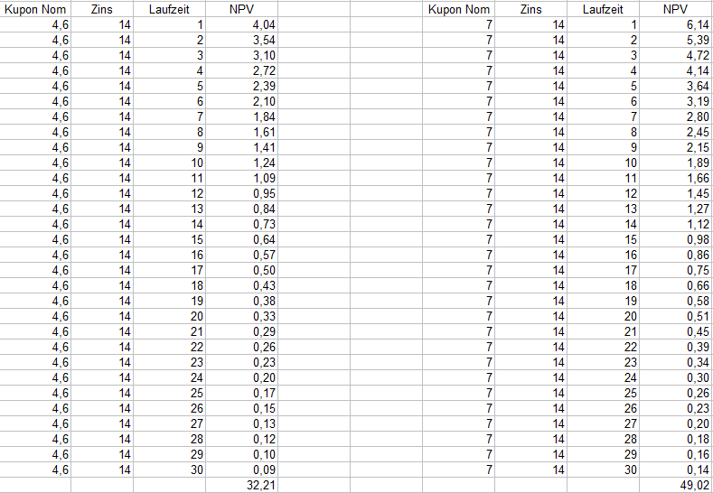 Die neue Anleihe hat einen NPV von 49%, Coupon 7%, Diskontierung 14%