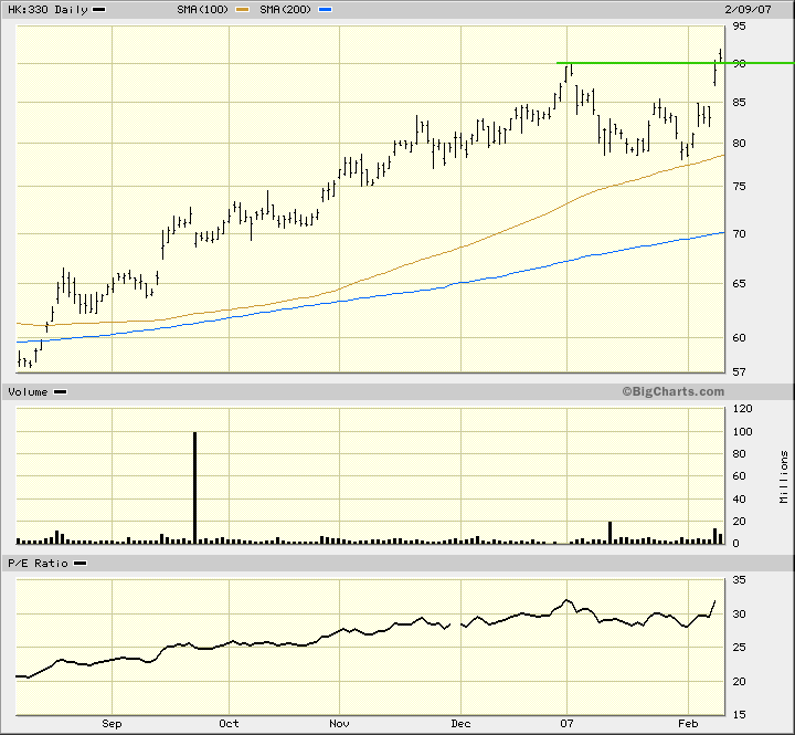 Das KGV (=P/E, vgl. untere Skala) sieht mit ca. 32 sehr hoch aus,