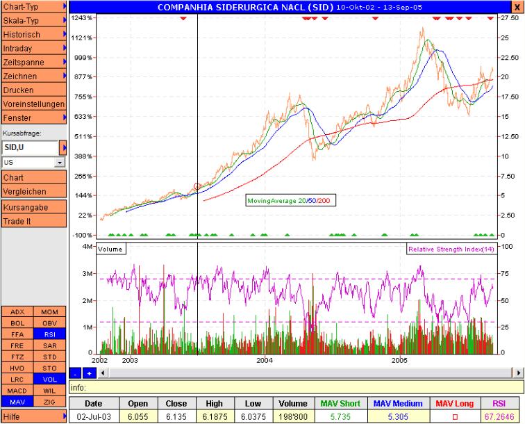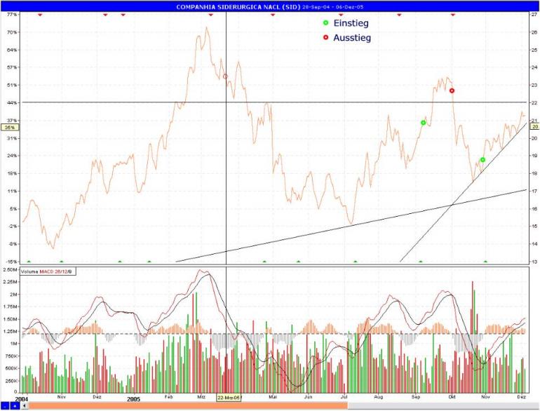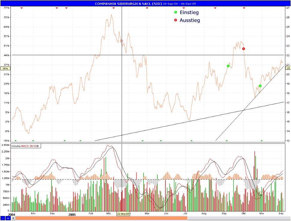 Lu99 Dezember 6, 2005 Das Papier ist interessant, ich bin gut im Geschäft. Unten im Chart zu sehen, Einstiege sind grün (Kreis), Ausstiege rot (Kreis). Soweit ich die Situation einschätzen kann, werde ich bei 22 aussteigen. Nachrichtentechnisch, hat sich wenig ergeben. Stahlpreise werden im Januar (global) etwas steigen, Erze und Kohle werden verharren. Somit sind die äusseren Umstände gegeben, dass das Unternehmen weiterhin gute Zahlen schreibt. Diesen Beitrag teilen Link zum Beitrag