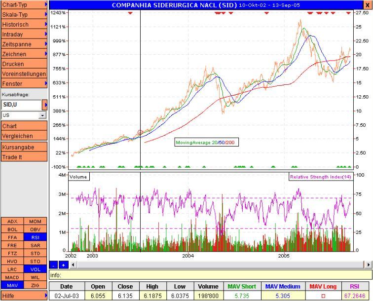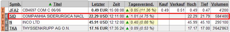 Lu99 September 13, 2005 Companiha Siderurgica Nacional, (ISIN US20440W1053) oder kurz CSN Im Web zu finden unter: http://www.csn.com.br/ Kurz Portrait: CSN ist ein Brasilianischer Stahl- und Eisenerzkonzern, mit verschiedenen Nebenaktivitäten (Cement, Zuschläge, Power Generation u.ä.). Der Konzern hat eine "gigantische" Produktionsanlage im Bundesstaat Rio de Janeiro, ein komplett integrierter Stahlherstellungskomplex für 4.8mio tonnen pro Jahr. Des weiteren wird Eisenerz abgebaut und exportiert. Nebenbei werden noch einige nebengeschäfte mit gezogen, ein Kraftwerk, Kalkgruben und ähnliches. Nun zu den Kennzahlen (Eine ist besonders Bemerkenswert) In mio R$ (1 -> ca. 2.6R$) Netto Umsatz: 9800 mR$ EBIT: 4789 mR$ Marge: 49% Beschäftigte: ca. 8000 PS: Marge!!! ich bin gespannt auf die Dividende... PPS: Ich reise nächste Woche nach Brasilien zum dem Konzern, wenn da was faul ist werde ich's melden... Edit: was haltet Ihr davon? ich bin seit kurzem investiert und weiss nun nicht so richtig ob ich halten soll oder nicht. Diesen Beitrag teilen Link zum Beitrag