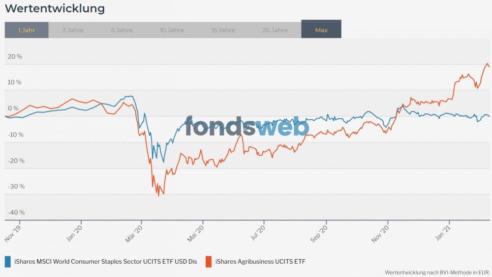 aragon7 Februar 12, 2021 Mag nicht ganz hier hin passen ....... Ich frage mich, warum die steigenden Lebensmittelpreise nicht auch auf den Consumer Staples durchschlagen ? Der dümpelt seit September 20 vor sich hin, seit Mitte November verliert er gar. Wo liegt mein Verständnis-Problem ? Da ich den Wisdom Agri nicht finden kann habe ich die beiden entsprechenden iShares-Produkte zum Vergleich herangezogen. Agriculture vs. Consumer Staples Diesen Beitrag teilen Link zum Beitrag