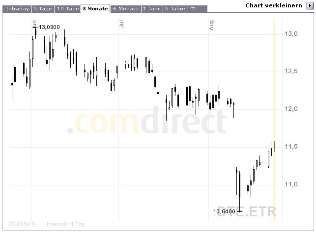 et3rn1ty August 23, 2006 · bearbeitet August 23, 2006 von et3rn1ty weil sich der Ausstieg bei 11 für mich z. Zt. nicht lohnt. Ich warte und hoffe, bis die Aktie wieder auf mindestens 15 steigt. Dann überlege ich weiter. Na dann bin ich auf deine Argumentation gespannt, wenn der Kurs auf die 9 Euro zugeht. Das wären dann nochmal 20% Verlust mehr. Der erste Schritt zum Börsenerfolg ist nunmal, dass man sich Fehler eingestehen muss. Das Geld welches du jetzt blockierst, kannst du längst woanders anlegen. Sieh Dir mal den Chart an. Meiner Meinung nach sieht es nach Aufwärts aus. Na dann zeig mir mal hier den Aufwärtstrend. Grüße, et3rn1ty. Diesen Beitrag teilen Link zum Beitrag