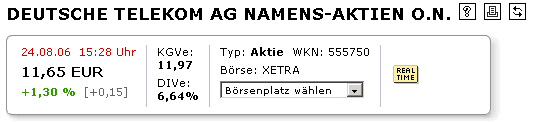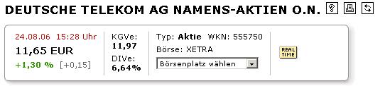 crosplit August 23, 2006 · bearbeitet August 23, 2006 von crosplit Langfristig muss ich sagen, sind die Aussichten recht Chancenreich. Wenn der Sparkurs weiter gehalten wird.Geben wir der Telekom noch 2 Jahre, dann sieht die Welt ganz anders aus. Tja, jetzt sind über zwei Jahre um seit deinem Posting und es sieht sehr viel schlechter aus...oder war dein posting nur ironisch/sarkastisch gemeint??? Ich meine trotzdem das die T-Aktie mit ihrem jetzigen Kurs klar unterbewertet ist, das heißt aber lange noch nicht das sie steigt...oder steigen wird... Diesen Beitrag teilen Link zum Beitrag