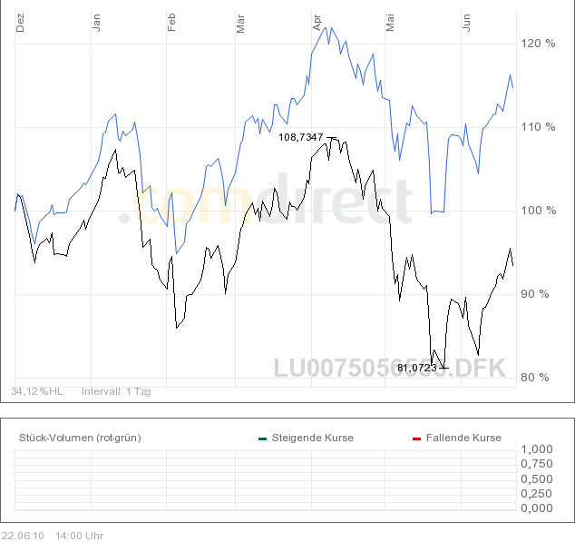Betrachtet man das ganze mti den Augen eines EUR-Anlegers (d.h. man rechnet auch den USD-Fonds in EUR um), so entwickeln sich beide natürlich deckungsgleich: