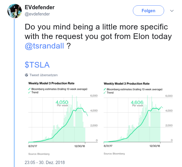 Bis jetzt ist nicht ein Model 3 für Europa produziert, das sie im Februar ausliefern wollen. Es gibt auch noch keine EU-VINs in der Menge, wie sie sie dafür bräuchten. Ob die Rechnungsnummern linear hochgezählt werden, ist auch fraglich, wenn bei den VINs schon so manipuliert wird von Tesla. Schau auch mal in das Model 3 Order Tracker Spreadsheet. Für Januar 2019 sind exakt 0 Auslieferungstermine eingetragen. Ende November waren es für Dezember noch 83. Was sagt uns das zur Nachfrage in den USA?