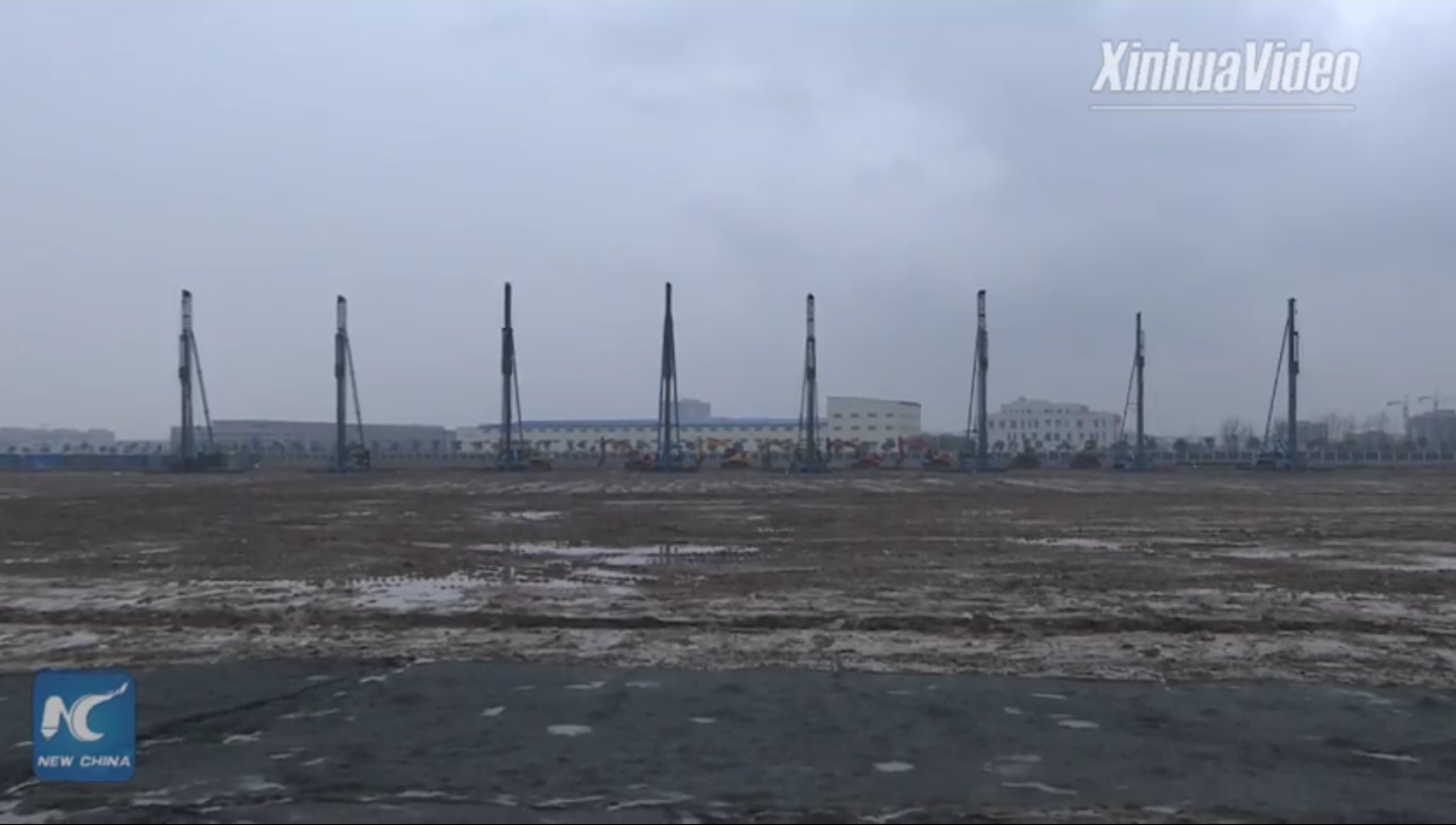 Aktuell im Winter, der in Shanghai von Dezember bis Februar geht, ist das Wetter von Kälte und Trockenheit gekennzeichnet. Mehr regnen wird es ja erst in der Regenzeit Juni+Juli und Taifunzeit August+September. Bis dahin ist die Fabrik dann ja fertig und die Produktionsanlagen am hochfahren, damit noch in 2019 dort Autos gebaut werden können. Diese Baumaschinen für Pfahlgründung stehen bestimmt nur als Kulisse für die Grundsteinlegung rum: