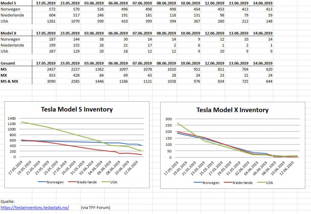 Holgerli Juni 15, 2019 Hier im Thread wird ja immer wieder behauptet, dass Tesla unheimlich große Lagerbestände hätte. Gerade beim Model S und X. Im TFF-Forum wurde nun angefangen das "Teslainventory" auf die drei Kernmärkte Norwegen, USA und Niederlande auszuwerten: Das Inventar wurde also in unter einem Monat auf 20% des Urspungwertes reduziert. Gerade das Model X ist also praktisch ausverkauft. Diesen Beitrag teilen Link zum Beitrag