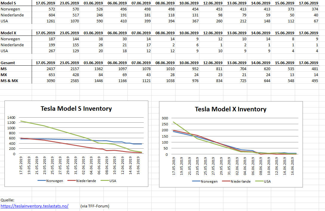magicw Juni 18, 2019 vor 30 Minuten von Holgerli: Dennoch werden die Autos verkauft wie geschnitten Brot. Abnehmende "inventory"-Zahlen heißen nicht zwangsläufig Verkäufe. Man kann einfach weniger Inventory ausweisen obwohl die Kärren noch auf Halde stehen. Hier kann Tesla tricksen wie sie lustig sind. Interessanter ist der Blick auf die Datenbanken der Zulassungsbehörden. Und da gibt es für NO, ES und NL tagesaktuelle Werte die auf https://eu-evs.com einsehbar sind. Und da sehen die Zulassungszahlen für MS/MX in 2019 deutlich mauer aus: Diesen Beitrag teilen Link zum Beitrag