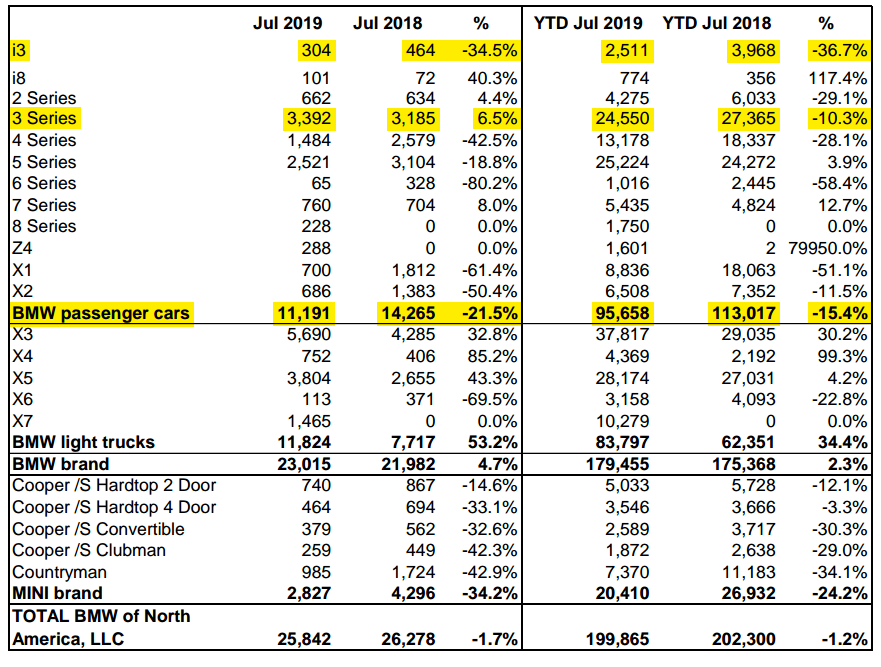 Die 3 Series hat zwar fuer Juli y/y ein Plus von 6.5%, allerdings hat BMW erst im Maerz die neuste Generation auf den Markt gebracht, und kumulativ liegt die 3 Series mit 10.3% im Minus.