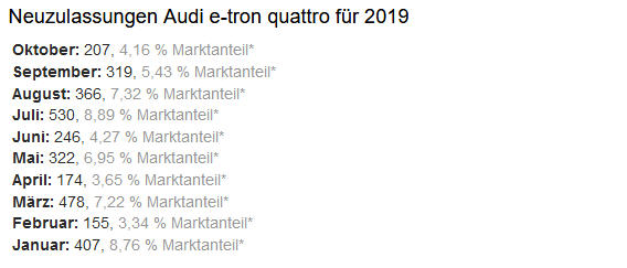 Holgerli November 21, 2019 vor 4 Stunden von reko: Nur hat BMW und VW die Verträge mit CATL schon vor Tesla unterschrieben. Nur hat das Audi verdammt wenig geholfen beim e-Tron. Die Zahlen sind ein Desaster: Anfang des Jahres (oder war es noch letztes Jahr?) großspurig 55.000 Einheiten für 2019 angekündigt und was ist es geworden? Produktion (bis Ende September): e-tron: 27.621 e-tron Sportback: 147 Knapp die Hälfte bisher. Wenn das Bei Tesla passiert wäre... Und da rede ich noch nicht mal davon, dass nur 16.180 Stück ausgeliefert wurden. Quelle: Diesen Beitrag teilen Link zum Beitrag