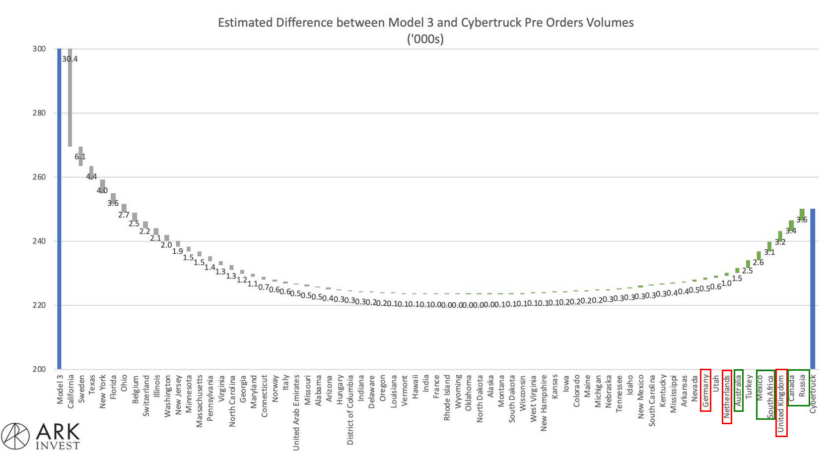 Holgerli November 29, 2019 Weil ja kaum noch über den Cybrtrck diskutiert wird hier mal eine kleine Auswertung: Es scheint so zu sein, dass Tesla mit dem Cybrtrck wohl die Leute des "Mittleren Westens" erreicht. Dort wo man mit dem MS und Model 3 deutlich weniger Erfolg hatte. Interessant finde ich dann die Aufstellung nach Ländern. Ganz rechts wird es dann spannend: Das besonders viele Interessenten in Australien, Mexiko, Kanada, Russland oder S-Afrika mit dabei sind, muss nicht überraschen. Das kann man über die geographischen Gegebenheiten erklären. Viel spannender sind Länder wie Deutschland, die Niederlande oder UK: Da könnte der Cybrtrck das neue Model X werden. Auch wenn es hier einige nicht hören wollen: Der Cybrtrck könnte die perfekte ergänzung zum M3 und MY werden, während die kommenen Plate-Modelle vom MS und MY das Angebot nach oben hin abrunden. Da es Twitter (1. Grafik) bzw. Twitter (2. Grafik) ist, hier dann auch der Link zur Homepage des Verfassers. Diesen Beitrag teilen Link zum Beitrag