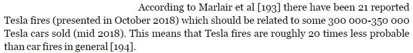 Ich schrieb: "Ein Prius mit NiMH Akku oder in  China populäre LiFeP-Akkus haben sicher kein Brandproblem" und "Tesla verwendet die am wenigsten sichere Chemie (NCA) in der ungünstigsten Konfiguration (Floor)". Durch Einbeziehen von kleinen Verbrennerbränden und  sicheren Akkus wird Teslas Akku zu positiv dargestellt.