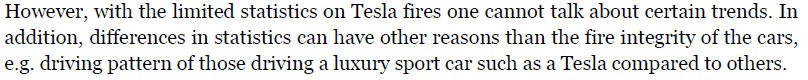 Die Typklassen als Indikator für erhöhte Brandgefahr heranzuziehen ist nun vollkommen daneben bei 40.000 Fahrzeugbränden im Verbrennerbereich jährlich (Schmorbrände sind wohl auch Versicherungsschäden). Die Typklassen bei Tesla sind auf dem Niveau vergleichbarer BMW (z.B. 5er haben alle in der VK ca. 27 -30) nur in der Haftpflicht sind sie günstiger und Tesla deutlich teurer. D.h. Tesla verursachen häufiger als andere Unfälle. Dies ist auch unmittelbar plausibel, wenn man berücksichtigt, dass die Autofahrer bislang Verbrenner gewohnt waren und nicht die Überlegenen  Beschleunigungseigenschaften von E-Autos wie den Teslas, die durch die brutale, unmittelbare, geschossartige Beschleunigung begeistern, aber damit entsprechendes Gefährdungspotential für den ungeübten Fahrer bergen und schwerer zu fahren sind. Ich selbst hatte schon einen Unfall mit einem BMW 550i aufgrund eines unachtsamen Beschleunigungsvorgangs. Bei mangelnden Fahrkünsten (da schließe ich mich ein), sind die enormen Beschleunigungskräfte Spassfaktor und Fluch zugleich.