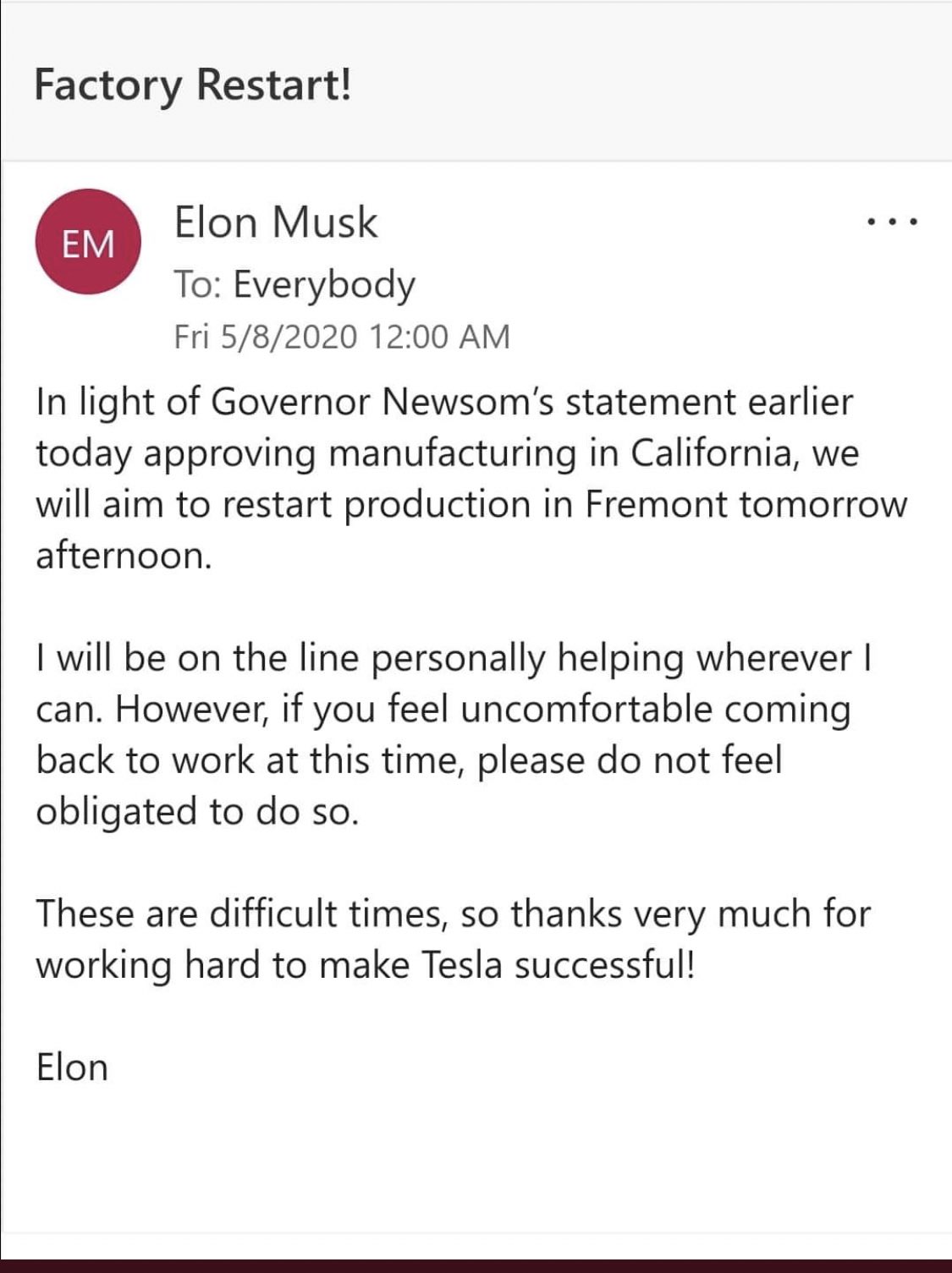 Die Produktion kann am Montag in Fremont wieder aufgenommen werden. Ganz offiziell.