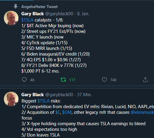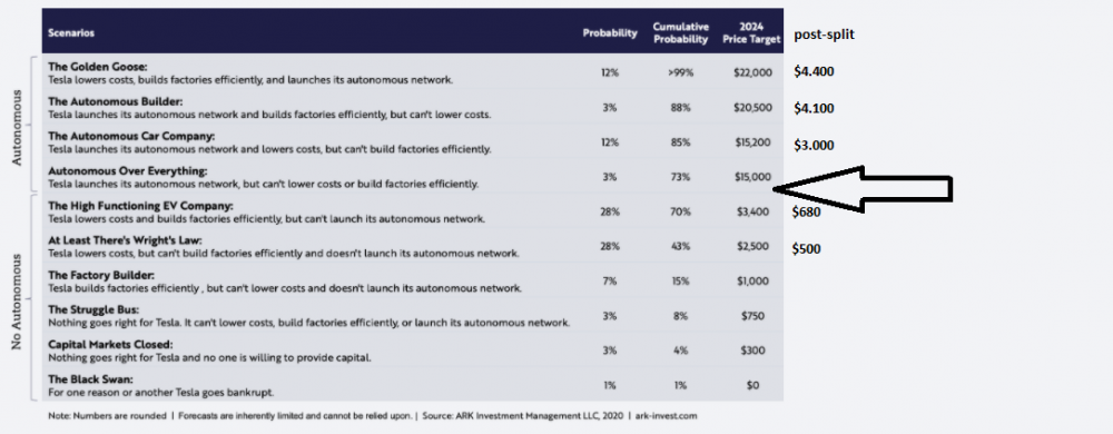 Der Kurs, den ARK Invest für 2024 prophezeit hat unter der Vorraussetzung, dass der Autopilot super läuft, ist bereits 2021 erreicht. Ohne, dass irgendwas davon eingetreten ist. Sollte das den Tesla Fan nicht selber etwas wundern? Sollte man da nicht mal hinterfragen, was da eigentlich passiert, wenn der Kurs wohl so entkoppelt ist selbst von den bereits damals recht optimistischen Annahmen?