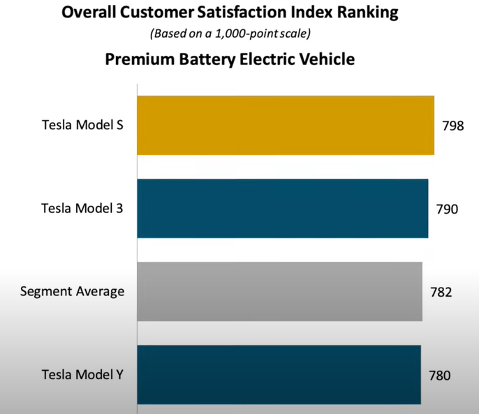 The Tesla Model S received the highest customer rating, scoring 738 of a possible 1,000 points. This is reminiscent of Consumer Reports 2013 study that ranked the Model S as the “Best Car Ever Tested.”