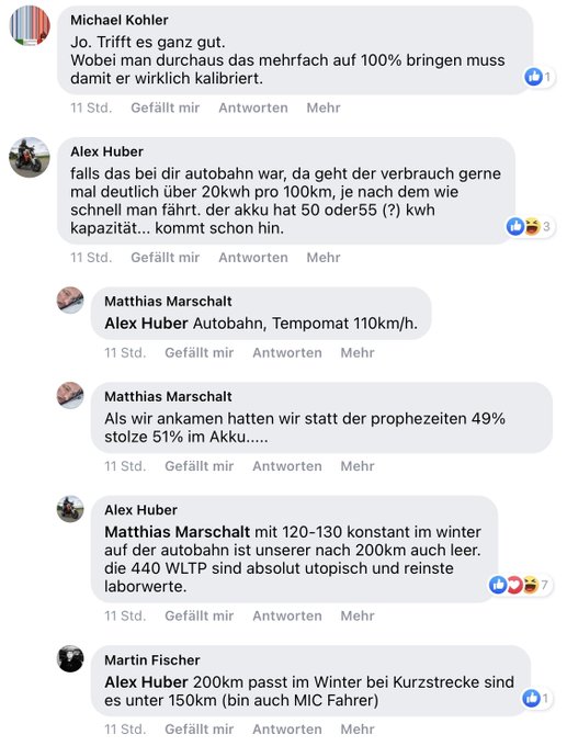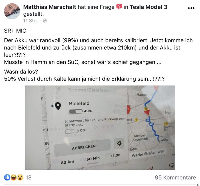 frogger321 Januar 26, 2021 vor 35 Minuten von Michalski: Für @herbert_21 hier mal eine seriöse Informationsquelle mit Infos direkt von denen, die es wissen müssen: Tesla Model 3 | Facebook Der Thread ist einfach nur Realsatire. Reichweite bei Kurzstrecke unter 150km! Sobald man die Heizung im Winter runterregelt oder die A/C im Sommer auslässt oder konstant 110 km/h auf der Autobahn fährt, um Akku zu sparen, fährt man das falsche Auto. Der SR+ mit dem neuen Akku scheint ein Biest zu sein, das gezähmt werden möchte. Mist, mein Popcorn ist jetzt alle. und gestern wurde über meinen Strom-Kommentar zur Lenkradheizung noch gelacht Ist doch klar, dass solche "Funktionen" wie Heizung oder Klimaanlage für ein e-Auto Gift sind, besonders im Winter Diesen Beitrag teilen Link zum Beitrag