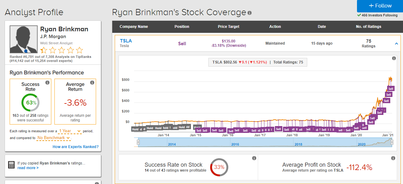 Hier sieht man die Langzeit-Perforamance von Ryan Brinkman's Price Targets auf Tesla. Man muss sich leider bei tipranks.com registrieren, aber dann kann man sich kostenlos folgende Ansicht erstellen: