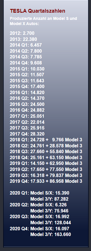 Holgerli Februar 27, 2021 Nein, ich wollte NICHT beide Modelle addiert haben. Schon allein daran sieht man, dass Du es nicht verstanden hast worum es (mir) ging. Kleiner Tipp: Man geht für solche Zahlen nicht auf "Live-counter.com" sondern auf ir.Tesla.com. Da findest Du für jedes Quartal die genauen Zahlen. vor einer Stunde von frogger321: da wirst du uns wahrscheinlich recht geben. Wer ist "uns"? Was ist DEINE Meinung? Oder hast Du keine eigene Meinung? Diesen Beitrag teilen Link zum Beitrag