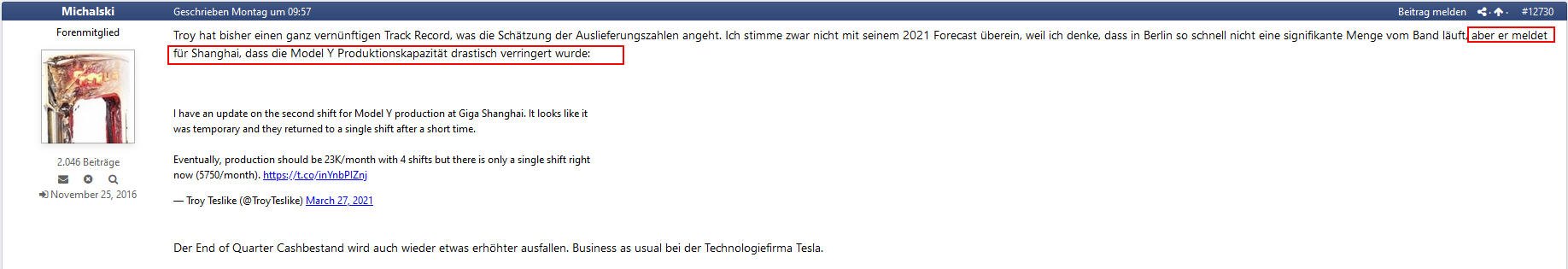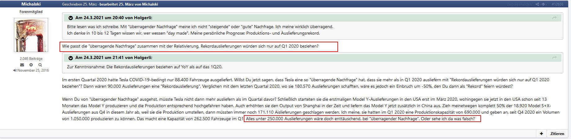 Holgerli April 2, 2021 vor 9 Minuten von Michalski: Was hatte ich zu den Auslieferungen in diesem Quartal geschrieben? Ich habe mal Screenshots gemacht, weil ich Dir zutraue, dass Du Dein Zeug nachträglich editierst, sodass es nicht mehr ganz so lächerlich aussieht. Da wäre einmal das hier: Hier machst Du Dir eine Aussage zu eigen, dass das mit der Produktion nicht so läuft wie vorgestellt. Hier lamentierst Du drüber, dass die überaus optimistischen Zahlen jetzt kurzfristig zurückgenommen werden: Und hier erzählst Du mir dann, dass für ein Rekordquartal die Q4-Zahlen übertroffen werden müssen: und baust Dir gleich am Ende den Notausgang und sagst, dass es mindestens 250.000 Stück werden müssen. vor 18 Minuten von Michalski: Die hochpreisigeren und margenträchtigeren Model S+X sind einfach verschwunden. Da lügst Du Dir doch selber in die Tasche weil Du weilst, dass hier das Ramp-up der neuen Modelle des MS und MX gerade erst begonnen hat. vor 19 Minuten von Michalski: Selbst wenn man Model S+X komplett rausnimmt, so lag die Produktionskapazität bei mindestens 237.500 Fahrzeugen im Q1 und die Auslastung damit bei nur 76%. Hier mal nicht vergessen, dass Tesla 2 Wochen Produktionsstopp wegen Chip-Mangel hatte. Ups und rechnet man die Zahlen mit ein ist man bei 220.000 Stück. oder 93%. Wir fassen zusammen: - Du hast keine richtigen Argumente mehr, das REKORDQUARTAL schlecht zu reden - So richtig krass wird man das Wachstum erst sehen, wenn man dem den Einbruch der Althersteller im 1Q 2021 gegenüberstellt - Wenn es um das Standing von VW geht und Deine Frage wann VW Tesla bei den BEV-Auslieferungszahlen überholt (2021 oder 2022), werde ich Dir die Antwort geben: Weder noch. Ach ja: Was ist so richtig klasse an den Zahlen finde: In Europa finanziert Fiat die GF Berlin mit und in China nun Volkswagen die GF Shanghai. Mal schauen wer in den USA die Giga Texas von den Altherstellern mitfinanzieren wird. Diesen Beitrag teilen Link zum Beitrag