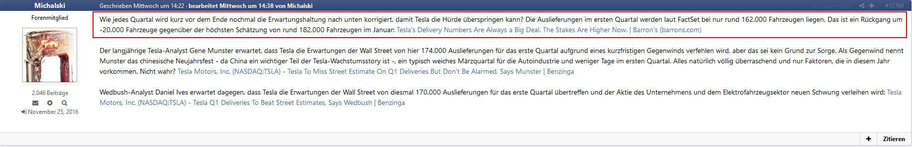 Michalski April 1, 2021 vor 16 Stunden von fancY: Nur weil Alex Voigt Tesla-Investor ist hat er nicht automatisch Unrecht. Sein Twitter ist auch normal, er verlinkt dort seine Artikel von https://www.elektroauto-news.net Alex Voigts Argumente sind jedoch falsch. Der verkürzte Tweet war einfach für die Bildschirmdarstellung im Fernsehen auf den relevanten Teil gekürzt, nämlich die ersten zwei Sätze. Die Kritik am Wasserverband ist Quatsch. Selbst das Umweltministerium gibt mittlerweile zu, dass die Wasserversorgung in der Gegend nicht gesichert ist. Die haben einfach die Reserve Tesla zugeschlagen und jetzt hat der Versorger null Reserven. Dafür aber weitere Anforderungen von Tesla (denk mal an die Batterieproduktion, die haben sie ja einfach nur aus dem Antrag entfernt, um den Wasserbedarf optisch zu senken), die zehntausenden Neubürger, die wegen der Fabrik dahin ziehen, weiteres Gewerbe, das sich ansiedelt, etc. Auch ist der WSE natürlich der Versorger vor Ort - ich weiß gar nicht, wie er darauf kommt, dass der 2023 nicht zuständig wäre. Er hat dafür auch keinen Beleg. Die Kritik an dem Gewerkschaftsinterview ist Schrott. Einfach mal die Stelle anschauen im Video, da ging es um die Verhältnisse in den USA. Aber Tesla soll sich auch Brandenburg nur an dem vergleichsweise niedrigen Metalltarif orientieren. Das ist nicht zu vergleichen mit dem, was VW, Audi, BMW oder Mercedes in ihren Stammwerken der Belegschaft zahlen. Von den ganzen tariflichen Sonderleistungen will ich gar nicht erst anfangen. Tesla hat kein Weihnachtsgeld, kein Urlaubsgeld, keine Schichtzulagen, etc. Da liegt Alex Voigt über all daneben. Was die Ex-Teslamitarbeiterin angeht, so verklagt sie Tesla wegen Verleumdung und hat wohl nur die Forderung verloren, vor einem ordentlichen Gericht angehört zu werden. Stattdessen findet jetzt die Verhandlung vor einem Schiedsgericht statt. Und auch bei der Sicherheit von Teslas Autos liegt er daneben, wenn ich nur mal auf die aktuellen Rückrufe schaue wegen der kaputten Radaufhängungen oder die Autopilot-Snafus sehe. Alles in Summe ziemlich dünn und wird in den Kommentaren von Sascha Pallenberg (früher Mobilegeeks) auch als Hitpiece bezeichnet. vor 16 Stunden von fancY: So viel ich weiß hat Tesla für den Vorfall mit den Probepfählen ein Bußgeld bekommen. Bohrungen sind im Trinkwasserschutzgebiet gesetzlich verboten. Genauso das Aufdecken des dort ungeschützt knapp unter dem Erdboden verlaufenden Grundwasserleiters. Deswegen hatt Tesla auch Pfahlgründungen explizit im ersten Antrag ausgeschlossen. Aber natürlich brauchen sie das im Märkischen Sand und Tesla bekommt von den lokalen Politikern jede Ausnahme genehmigt, die sie haben wollen, denn die wollen sich im Glanz der Ansiedlung sonnen. Dass da bei der Räumung und Rodungsarbeiten geschützte Tiere vermutlich getötet wurden, da ermittelt zwar der Staatsanwalt, aber da wird genauso wenig passieren wie beim mutmaßlichen freien Betanken der Baustellenfahrzeuge mitten im Wasserschutzgebiet ohne weitere Schutzmaßnahmen. Tesla darf in Brandenburg alles, wo bei anderen Firmen schon längst der Stecker gezogen worden wäre, weil sich niemand die Blamage antun will, die ein Verbot der Fabrik an der Stelle mit sich bringen würde. Siehe Datteln IV, das wird genauso durchgepeitscht. Trotz fehlender Baugenehmigung, die sogar vor dem Bundesverwaltungsgericht versagt wurde und gekipptem Bebauungsplan ging das Kraftwerk trotzdem ans Netz. vor 16 Stunden von fancY: Die Vorteile durch einen neuen Arbeitgeber hat der dt. Steuerzahler dafür. Man muß schon Beides betrachten. Und Erschließungskosten zahlt doch derjenige dem sein Grundstück an die Infrastruktur angeschlossen wird. Für Verluste fallen nirgends Steuern an, richtig. Außer z.B. Lohnsteuer für alle dort Angestellten oder Grundsteuer... Lächerlich. Glaubst Du wirklich, Tesla wird jemals signifikante Unternehmenssteuern in Deutschland zahlen? Das machen sie doch selbst in den USA nicht. Einzig in China zahlen sie Steuern, weil die Chinesen ihnen das in die Bedingungen ihres Vertrages reingeschrieben haben. vor 4 Stunden von herbert_21: Mein Chart sagt, dass die 650$ Linie wieder eingenommen, und die 200 Tage Linie nicht berührt wurde. Das ist langfristig bullish. Wichtiger ist, dass der Abwärtstrend nach oben hin durchbrochen wurde. Kurzfristig ist die Frage, wie der Markt die Q1 Earnings aufnimmt. Bei 160k wären wir 10.000 unter dem FactSet Consensus. Die Frage ist aber, was ist dann? Ist das eventuell schon eingepreist? Denn, am Freitag sind die Börsen geschlossen, und wie schaut am Montag die Zukunft aus, die ja bekanntlich an der Börse gehandelt wird? In EMEA "leakte" gerade eine Mail, dass sie die Verkäufe verdoppelt hätten. Im Q1 2020 lag Tesla bei 18.876 Einheiten. Na, lassen wir uns überraschen. vor 4 Stunden von herbert_21: Es werden drei Rekordquartale in Produktion, Auslieferung und Cashflows folgen. Irgendwann beginnen Berlin und Austin mit den Auslieferungen, und dann kommt der Cybertruck. Jede Menge positive Kurstreiber / catalysts. "Rekord" wie in "besser als im Vorquartal" oder wieder nur der Vergleich gegen den Coronazeitraum? Berlin kommt höchsten mit homöopathischen Dosen und vom Cybertruck sollte doch eigentlich schon längst das finale Design präsentiert werden. Ist bisher jedenfalls nicht passiert. Genausowenig wie wir eine funktionierende 4680er Zelle gesehen haben oder das Gigacasting erfolgreich funktioniert. Eine der beiden Pressen ist jedenfalls seit dem Brand ausgefallen. vor 4 Stunden von herbert_21: Sollte Tesla im April FSD ausgerollt werden z.B. auf 10.000 User, wäre das bullish, ebenso wenn man in ein oder zwei Städten um Genehmigung ansucht. Tesla hat kein Level 4 oder Level 5 fähiges System und ich bezweifle, dass sie FSD Beta an alle Kunden ausrollen werden. Dafür ist das zu fehleranfällig: Tesla's "Full Self Driving" Beta Is Just Laughably Bad and Potentially Dangerous (roadandtrack.com) vor 4 Stunden 