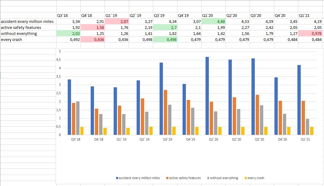 herbert_21 Juli 13, 2021 Kann es sein, dass du trotz fortgeschritter Excel Kenntnisse Schwierigkeiten hast, das Englisch richtig zu deuten? "Normale" Autos haben alle 484.000 Meilen einen Unfall, Tesla Fahrer mit Autopilot nur alle 4,19 Mio, und sind damit 8,3x sicherer unterwegs als Fahrer anderer Marken, und mit aktiven Sicherheitsfeatures immerhin noch 4,24x so sicher, nämlich alle 2,05 Mio Meilen. Die Werte schwanken innerhalb der Schwankungsbreite, und 2021 kamen keine neuen Modelle oder wesentlichen neuen Features. Wer im Tesla alle Sicherheitsfeatures inaktiv hat (erstes Model S ohne AP) ist immer noch doppelt so sicher unterwegs, wie alle anderen PKW. Das ist bemerkenswert und unterstreicht, dass die Sicherheit von Anfang an ein Leitmotiv bei der Fahrzeugentwicklung war. Um bei deiner hübschen Grafik zu bleiben: Je höher der Balken, desto sicherer. Diesen Beitrag teilen Link zum Beitrag