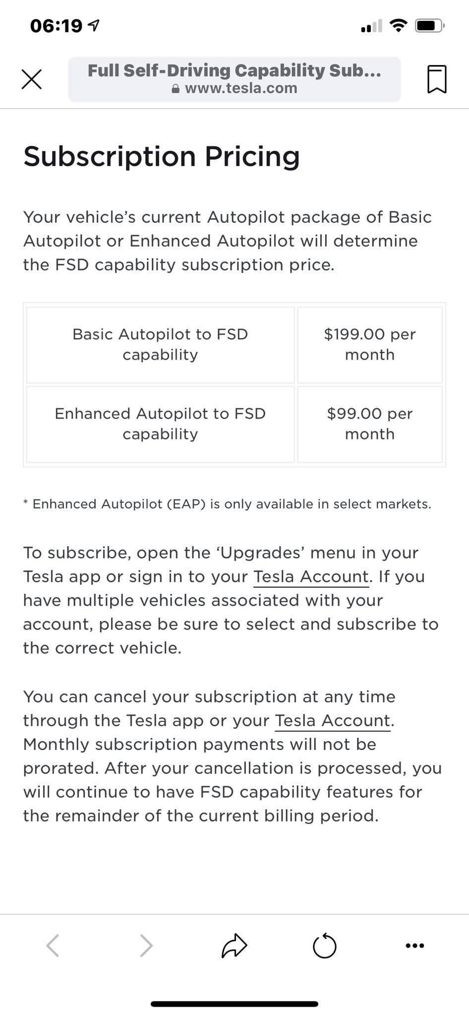 Life_in_the_sun Juli 17, 2021 vor 10 Minuten von herbert_21: FSD Subscription ist live: 99$ /Monat für Enhanced Autopilot 199$ / Monat für FSD Die Preise sind pro Fahrzeug. Quelle ? Diesen Beitrag teilen Link zum Beitrag