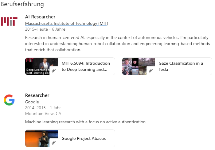 herbert_21 August 23, 2021 · bearbeitet August 23, 2021 von herbert_21 Formatierung Seine "Bias" wird jedenfalls die Kakophonie hier bereichern, IMHO. Und ja, im Gegensatz zu uns allen, versteht er auch die Technik dahinter. Homepage: https://lexfridman.com/ Beispiel für ein Paper am MIT: https://arxiv.org/pdf/1611.08754.pdf Aus seinem CV (Quelle: LinkedIn): Diesen Beitrag teilen Link zum Beitrag