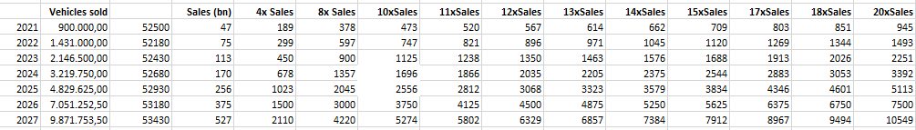 Barqu Dezember 19, 2021 16 minutes ago, Hauerli said: Wieso sollten sie, nur weil Sie jetzt 1.5 Millionen oder wieviel auch immer produzieren, in gleichem Maße weiter wachsen ? Na deswegen: 1 hour ago, herbert_21 said: Welches P/E in 2025? Zwischen P/E 50 und 100 Ergebnis gerundet auf 50 Milliarden. Wenn man den Aktienkurs rückwirkend sich anschaut, wird man erkennen, das Tesla immer zwischen 50 und etwa 100 gependelt ist. 1 hour ago, herbert_21 said: Ist ein 50er P/E nicht viel zu hoch? Antwort: Nein, nicht wenn man mit ~55% p.a. wächst Ohne 5 bzw 9-11 Mio Fahrzeuge wuerde diese Extrapolation ja nicht stimmen. Diesen Beitrag teilen Link zum Beitrag