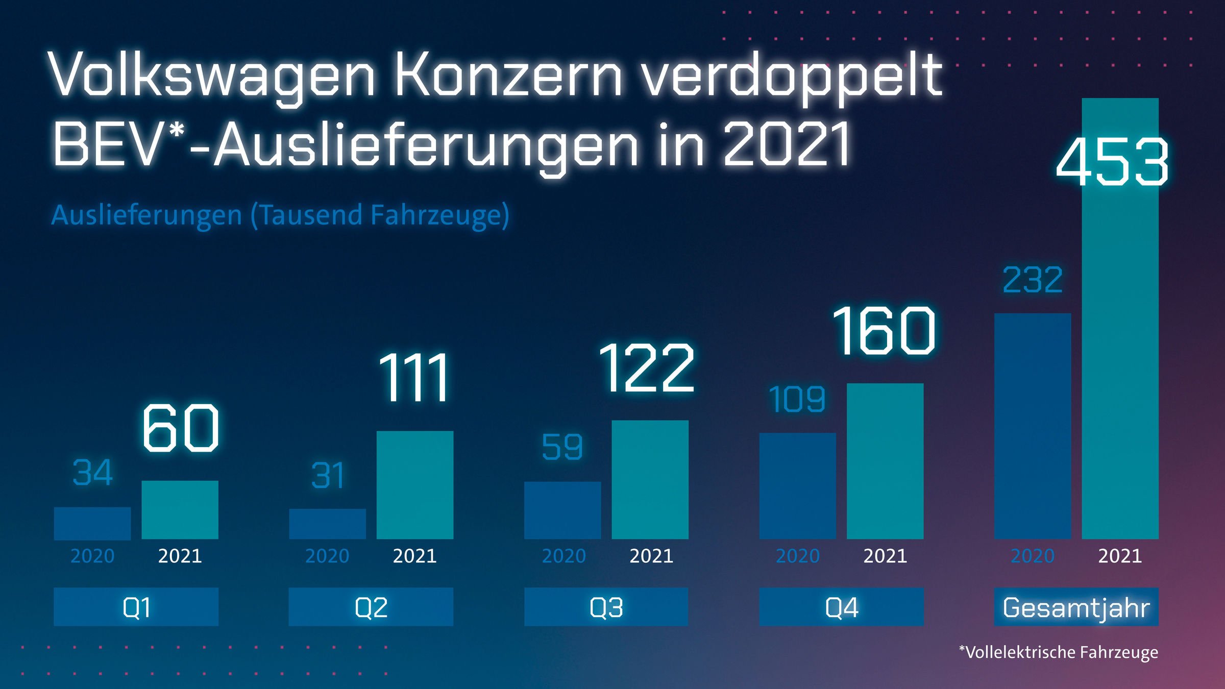 Holgerli Januar 13, 2022 Nachdem @Michalski ja so nett war und nochmal die 2021er Presse-Meldung des VW-Konzerns zu verlinken habe ich gerade mal geschaut. Die 2022 Meldung lautet: Volkswagen Konzern auf Kurs zu NEW AUTO: Auslieferungen vollelektrischer Fahrzeuge in 2021 verdoppelt Die relevante Grafik: Gut, etwa über 95% nenn ich mal eine Verdoppelung. Passt. Krass finde ich aber, dass der technisch veraltete und verramschte eUp! mit 41.400 Einheiten fast 10% der BEV-Produktion in 2021 ausmachte. Viel interessanter: Wie macht sich VW im Vgl. zu Tesla? Nun, um @Michalski Frage nochmal zu beantworten? 2022 wird VW Tesla definitiv nicht überholen? 2023? Ich bleibe bei 10% Wahrscheinlichkeit. Diesen Beitrag teilen Link zum Beitrag