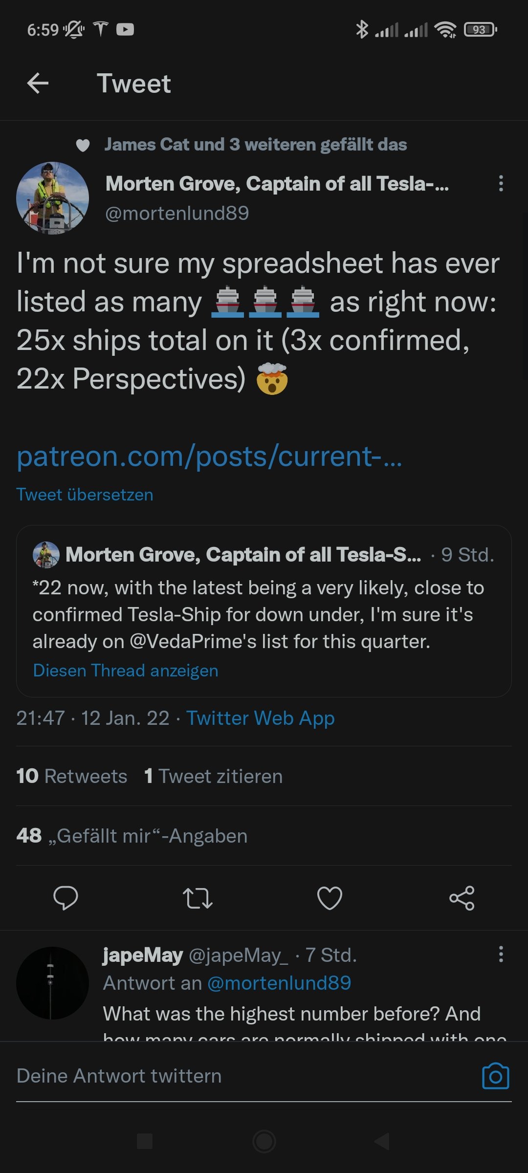 herbert_21 Januar 13, 2022 · bearbeitet Januar 13, 2022 von herbert_21 Guten Morgen! Kater as fuck, bin ich aufgewacht und Tesla hat aufgehört, den Übergang zu einer nachhaltigen Energienutzung zu beschleunigen? Hört Tesla jetzt auf zu wachsen, bricht die Nachfrage jetzt ein? Was meint der Webshop von Tesla? No inventory, kein einziges Model 3. Liegt wohl daran, das alle Bestandsmodelle verkauft sind. Wie sieht's mit der Anzahl der Schiffe aus, die den Nachschub vom Export Hub Shanghai nach Europa bringen? Im letzten Quartal waren das so 17-19. Jetzt sind es es 25 (bullish as fuck) Diesen Beitrag teilen Link zum Beitrag