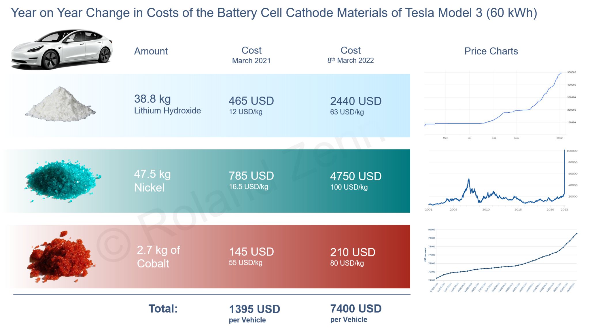 reko März 15, 2022 · bearbeitet März 15, 2022 von reko Es war absehbar, dass die Akkupreise mit steigenden Verbreitung von E-Autos sich so entwickeln werden. Die sinkenden Preise für Akkus kehren sich in das Gegenteil um. Man muß nur mal den Bedarf mit der Produktionskapazität der Minen vergleichen. Zugegeben haben Lieferkettenprobleme die Entwicklung jetzt beschleunigt. Im Vergleich zu Akkumetallen ist Benzin billig. 2022/03/08 Tesla and Other EV Makers Have Inflation Problems, Too. Just Like Soaring Oil Hurts ICEs. (Kathoden Rohstoffe für NCM90:5:5, 60 kWh) Diesen Beitrag teilen Link zum Beitrag